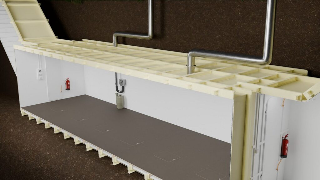 - Wykończenie: powierzchnia schronu piaskowana i malowana dwa razy podkładem epoksydowym, wykorzystywanym w żegludze morskiej, co zapewnia trwałą ochronę przed korozją.